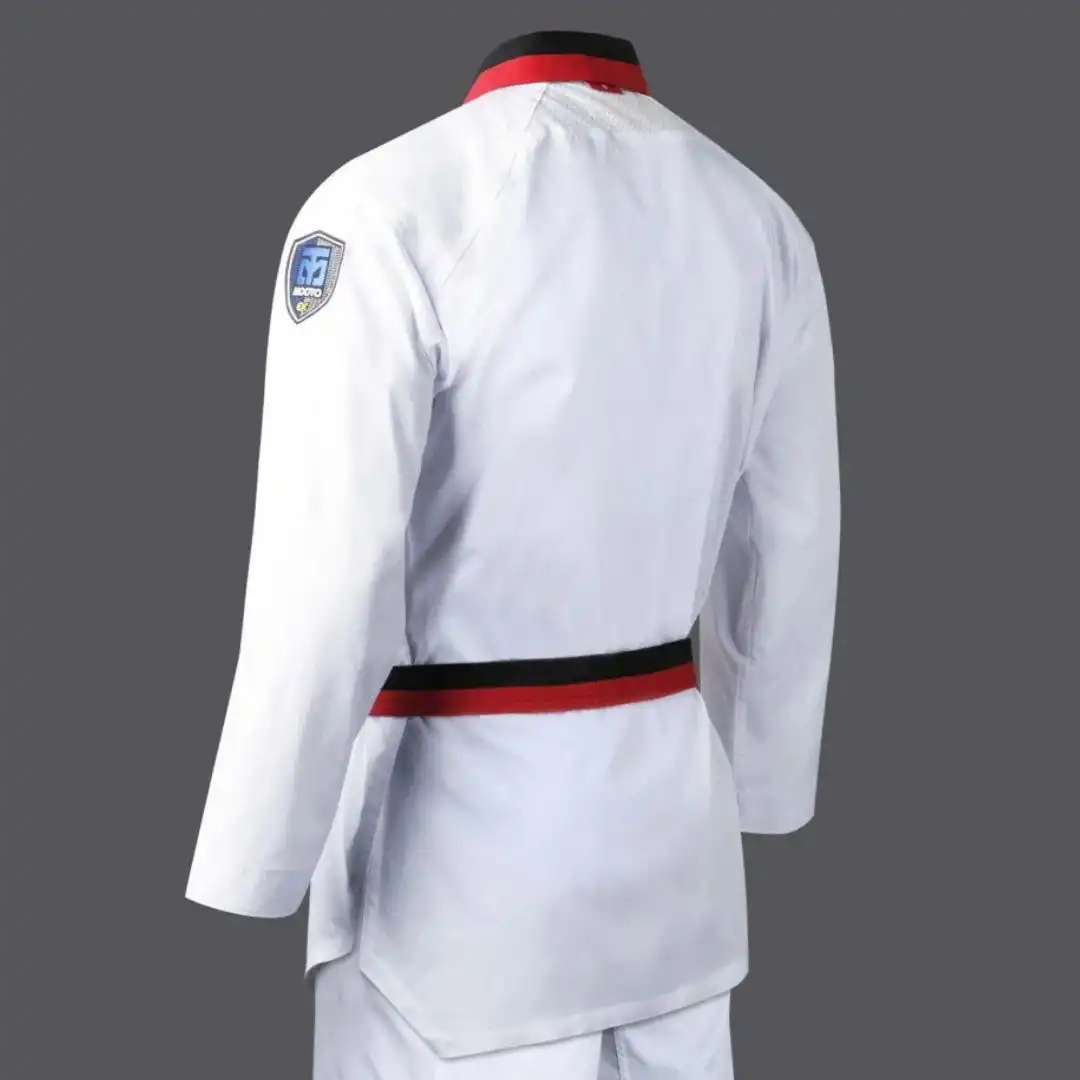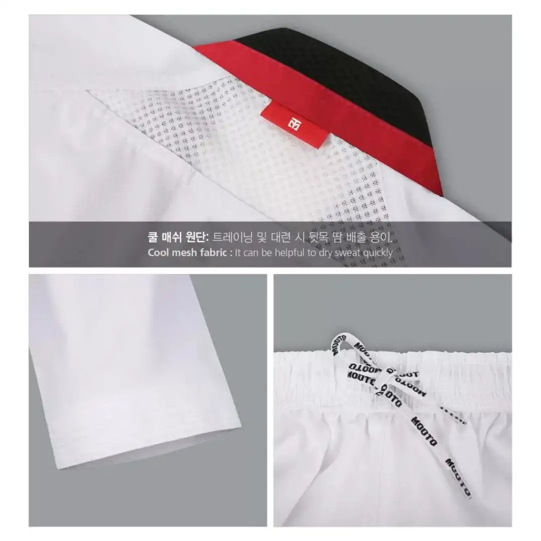 Mooto WT Approved Dobok Extera 6 Kyorugi Sparring Uniform White with Poom Neck – Στολή Taekwondo Mooto με Αναγνώριση WT (World Taekwondo) Λευκή με Κόκκινο-Μαύρο Κολάρο MO-1001